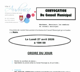 Convocation du Conseil Municipal du lundi 27 avril 2026 à 19h en mairie d'Audruicq Convocation CM Cliquer pour passer Convocation CM CM du 27 avril 2026Convocation du Conseil Municipal le 27 avril à 19h, en Mairie d'AudruicqPublié le 21 Avr. 2026 Consulter Slide précédente Prochaine slide Fin du carousel Retour à la liste Retour à la liste