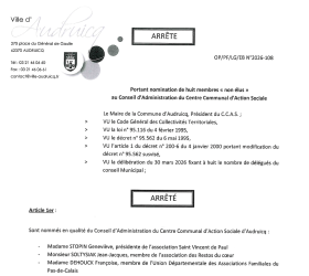 Le CCAS est dirigé par un Conseil d’Administration, présidé par le Maire. . Le Conseil est composé de manière équilibrée d’élus municipaux (8 élus) et de membres nommés par le Maire, issus notamment du tissu associatif local (8 membres) : associations familiales, structures représentant les personnes en situation de handicap, les personnes âgées et retraitées, ainsi que celles engagées dans la lutte contre l’exclusion.