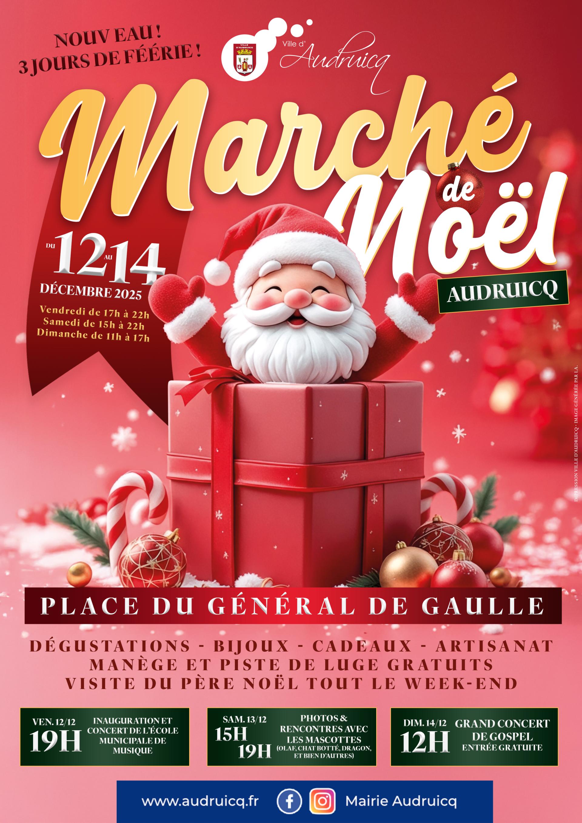 Audruicq vous donne rendez-vous du 12 au 14 décembre 2025 sur la Place du Général de Gaulle, pour le traditionnel Marché de Noël 2025 ! ❄️